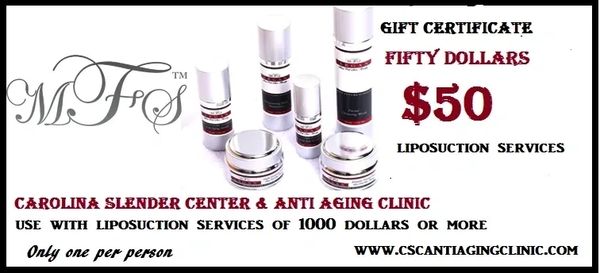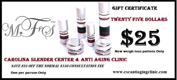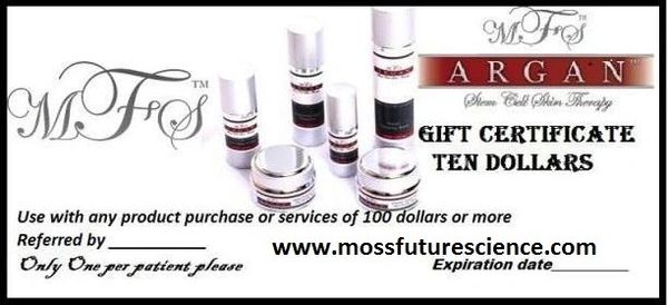 Ten Dollars Gift certificate to be used with any Anti Aging, Aesthetics, Argan Skin Care or Bariatrics services over 100 dollars.